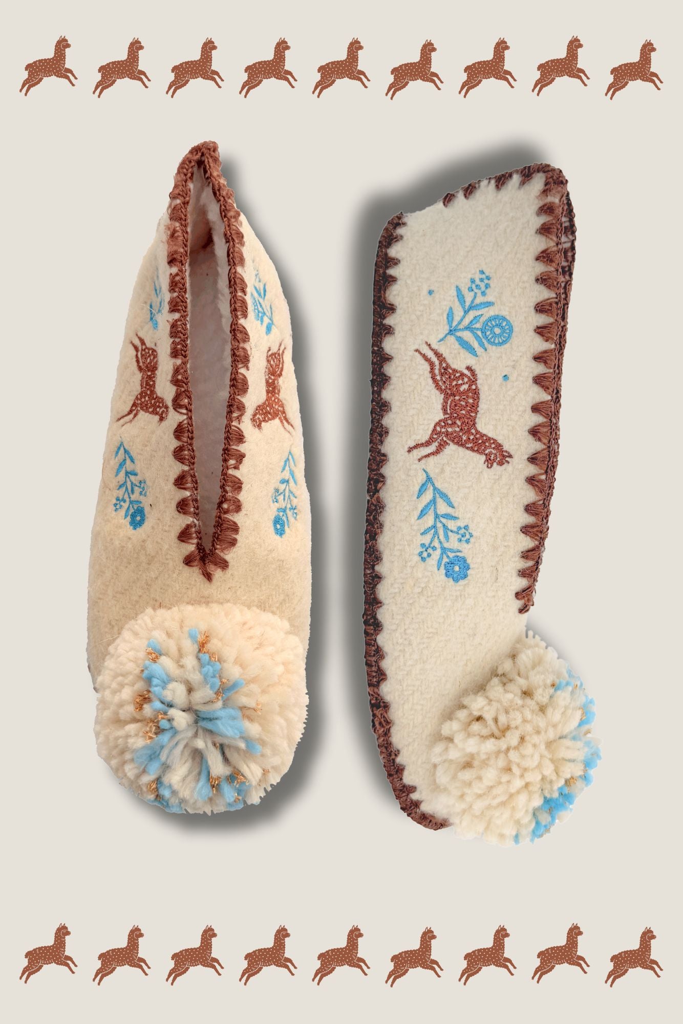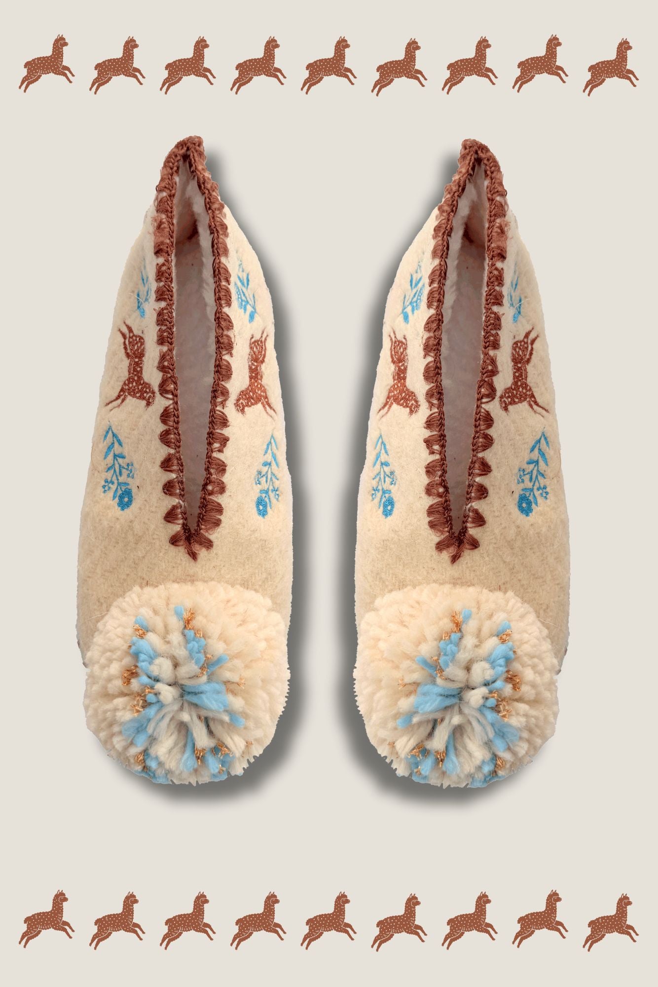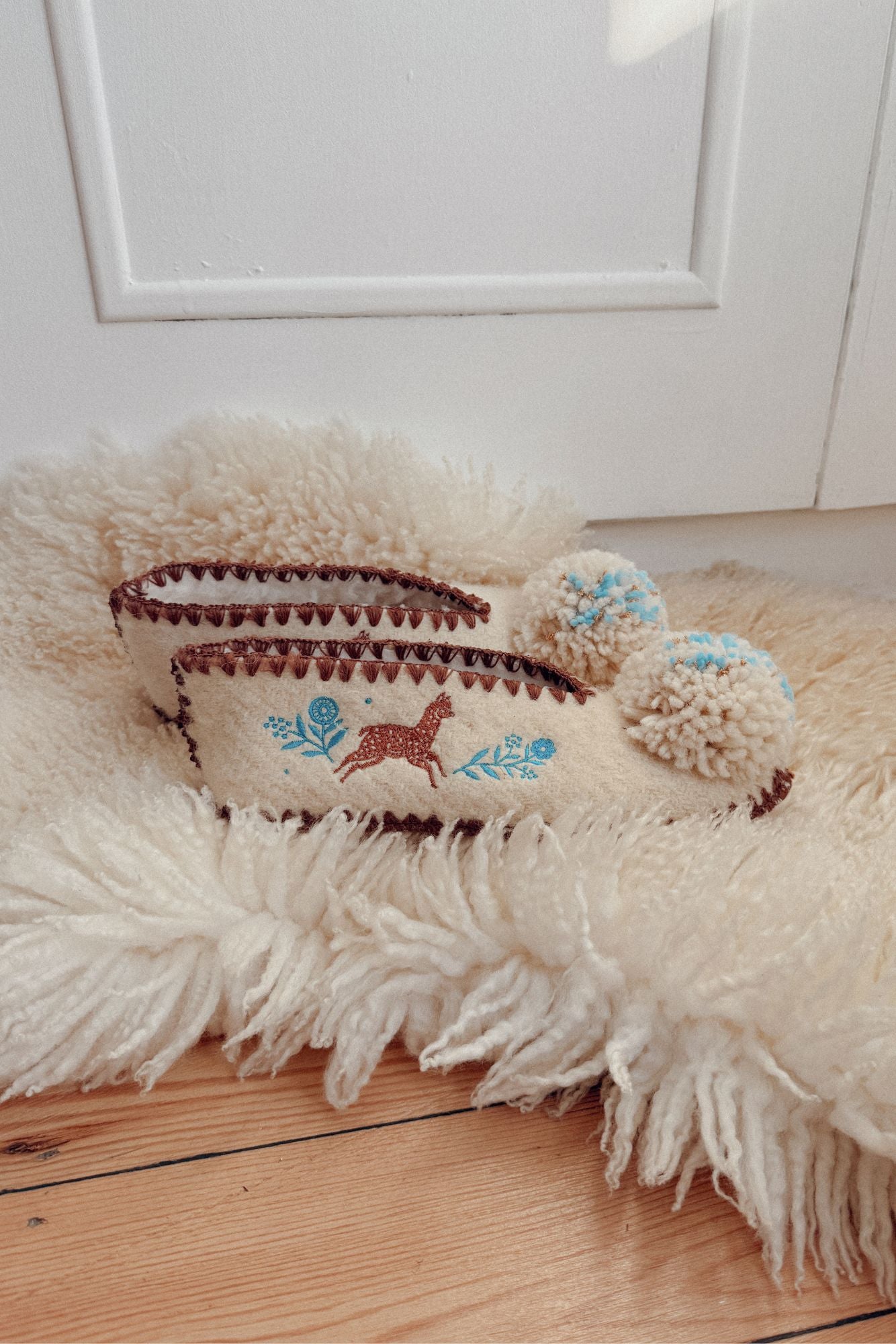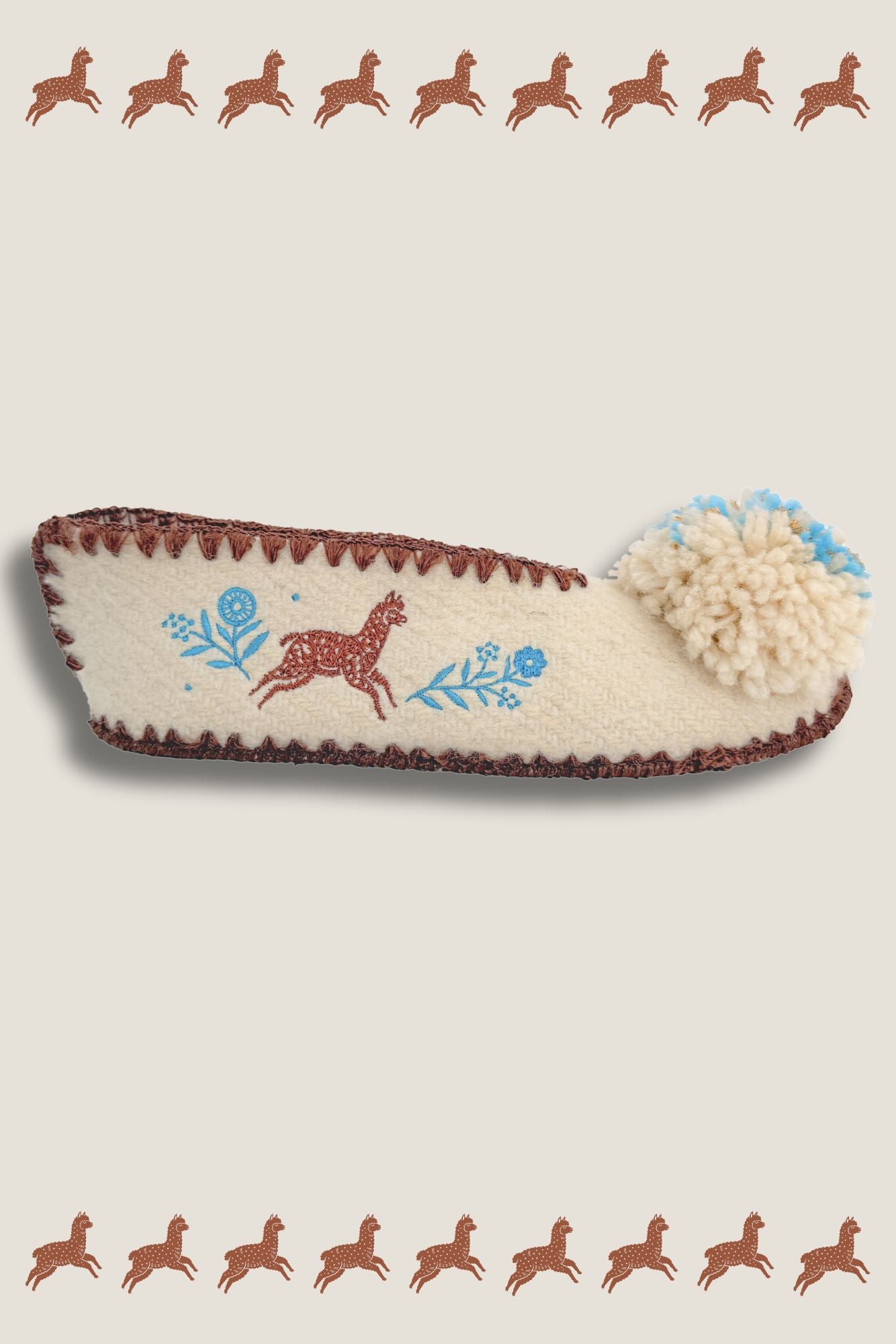 🌈 Finitions : Bords festonnés marron pompons brodés en laine naturelle, crème, bleu clair et fil de lurex doré