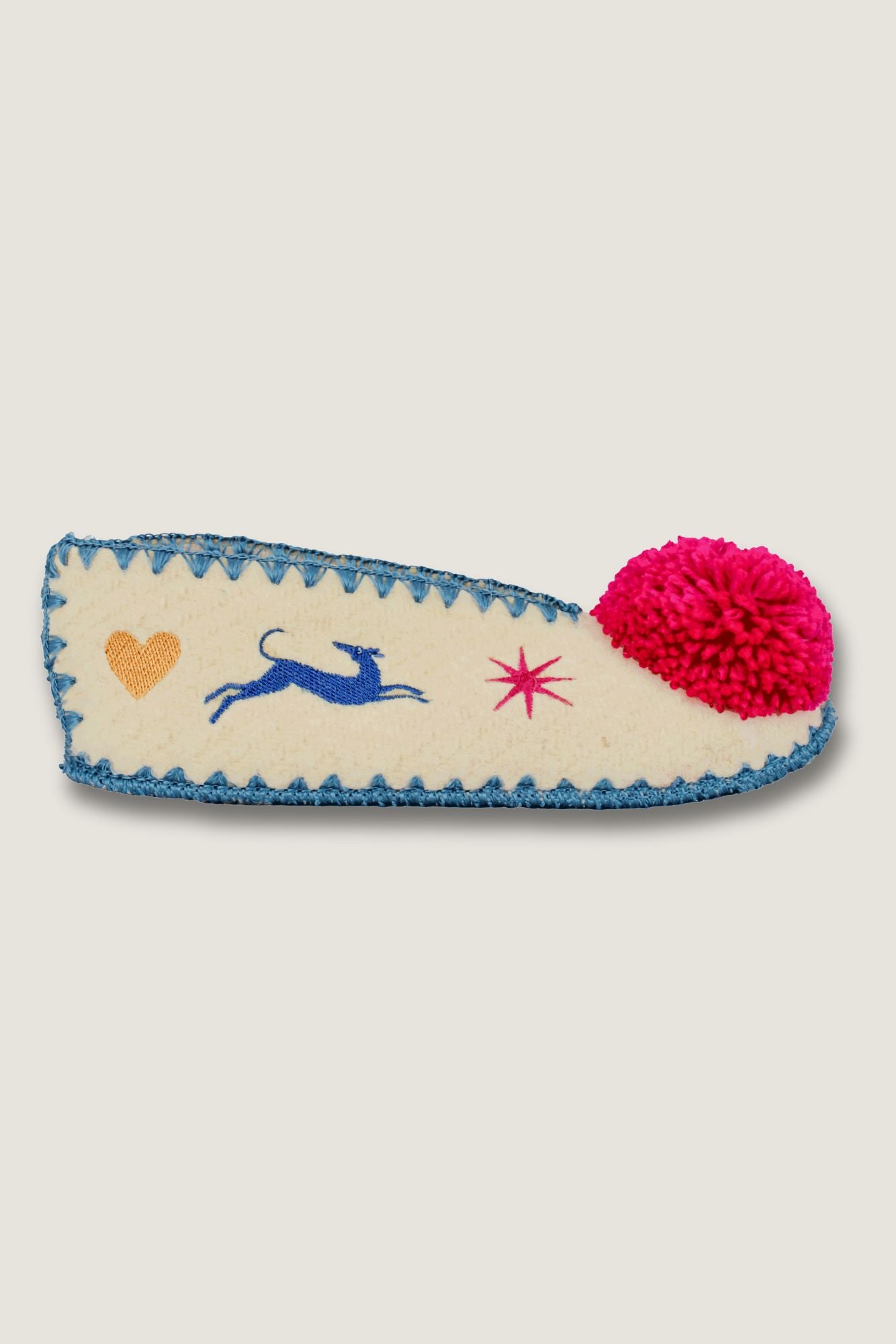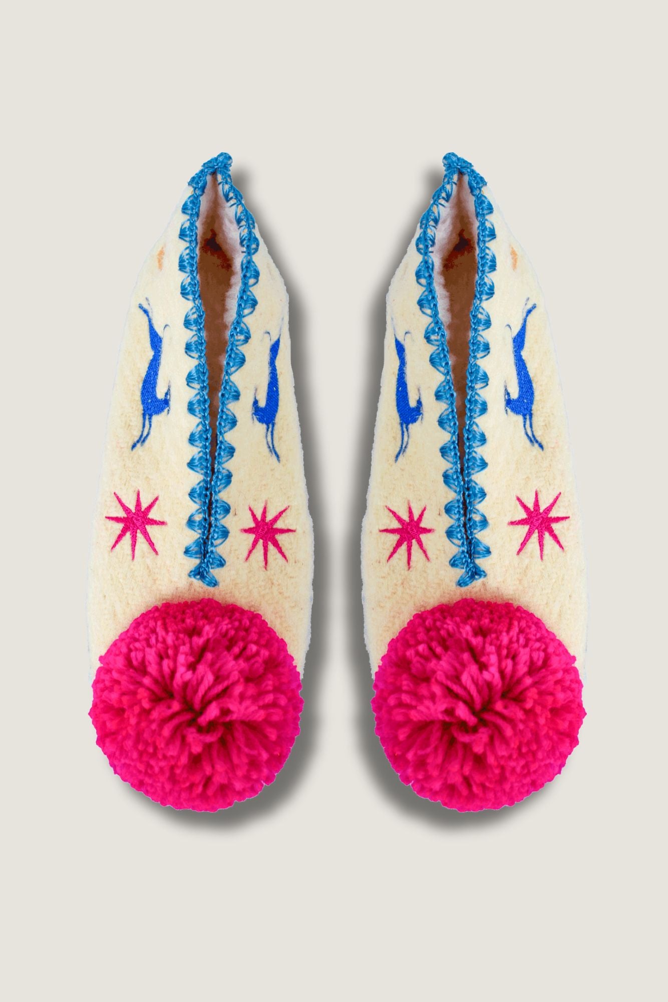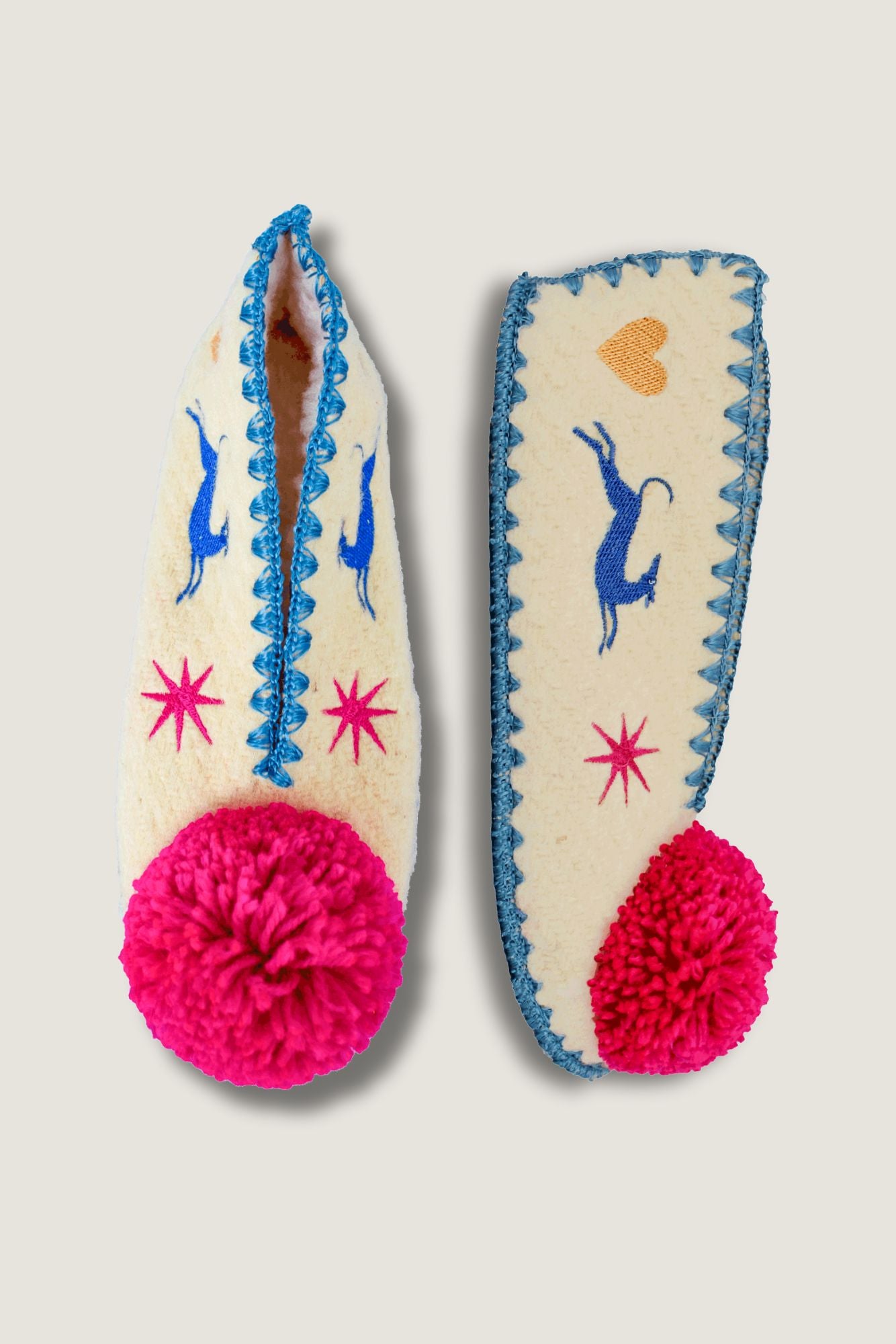 Leur laine naturelle non teintée procure douceur, chaleur et respirabilité, idéale pour toutes les saisons. Le pompon coloré, les broderies contrastées et les finitions soignées en font une pièce textile originale et durable.