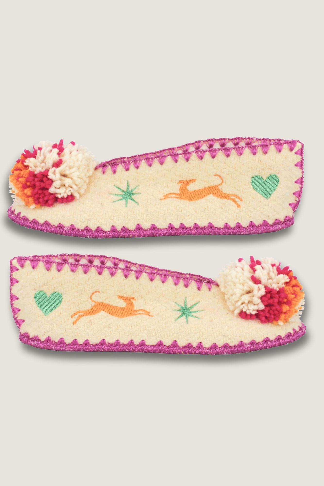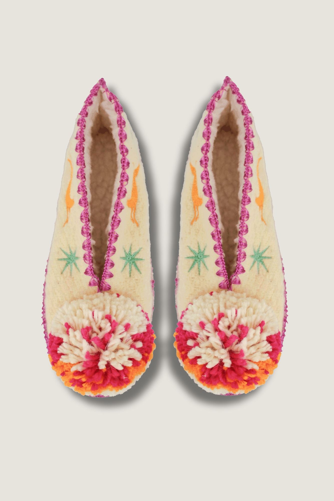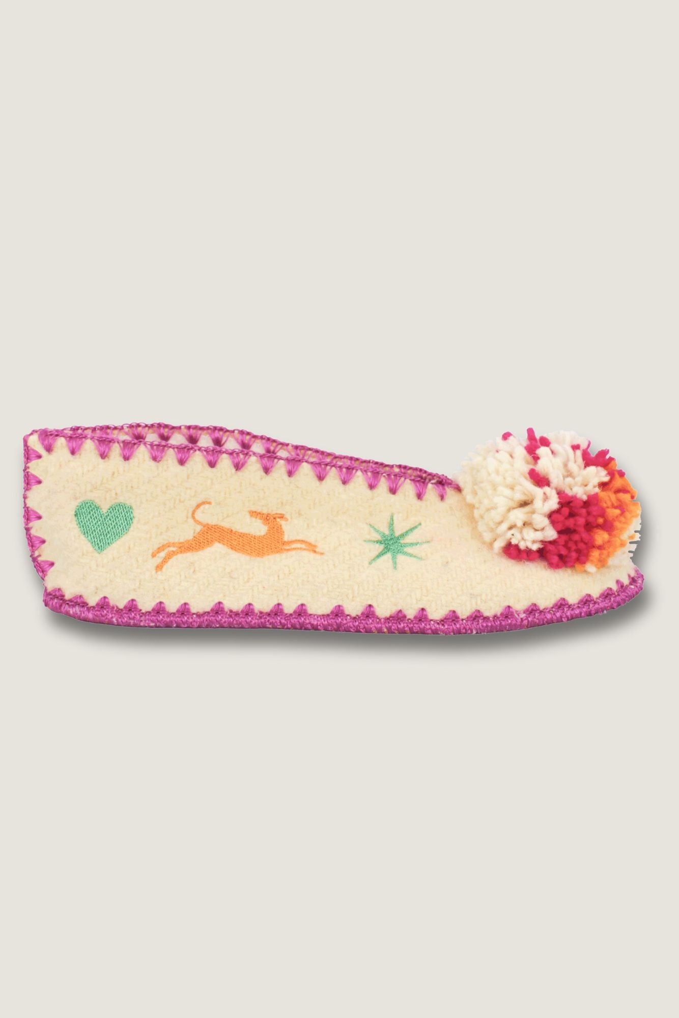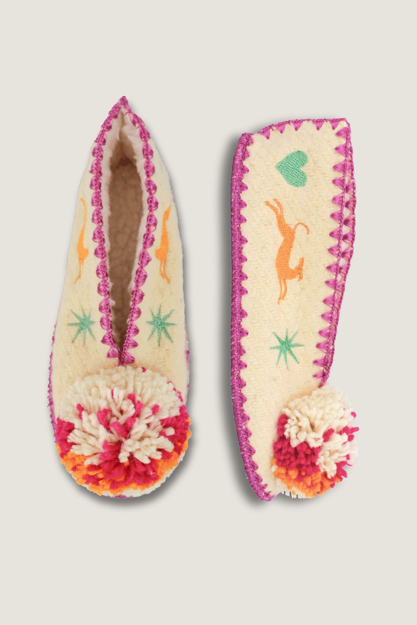 Leur laine naturelle non teintée procure douceur, chaleur et respirabilité, idéale pour toutes les saisons. Le pompon coloré, les broderies contrastées et les finitions soignées en font une pièce textile originale et durable.